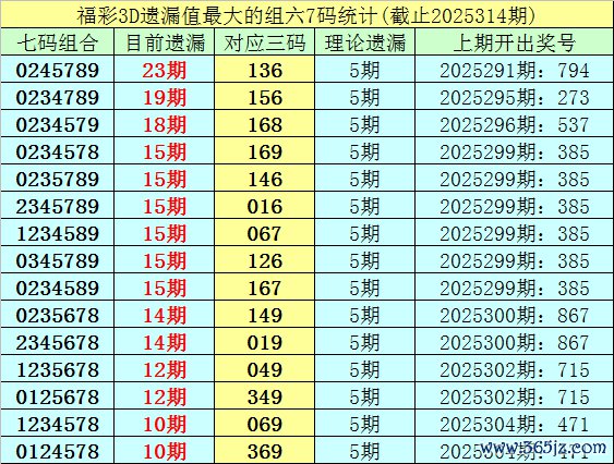 福彩3D七码遗漏组六分析(第2002001期-第2025314期)