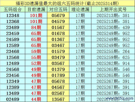 福彩3D五码遗漏组六分析(第2002001期-第2025314期)